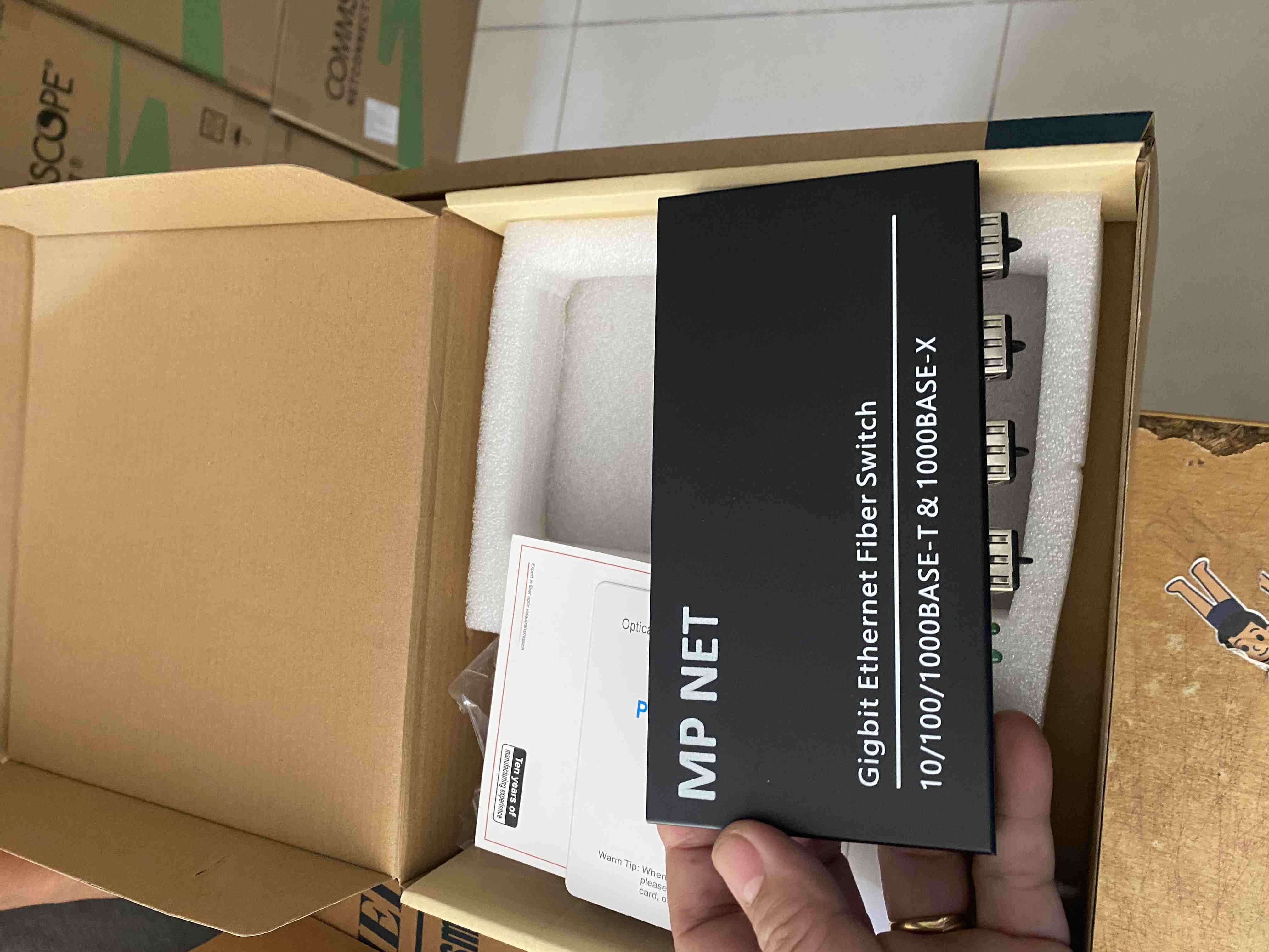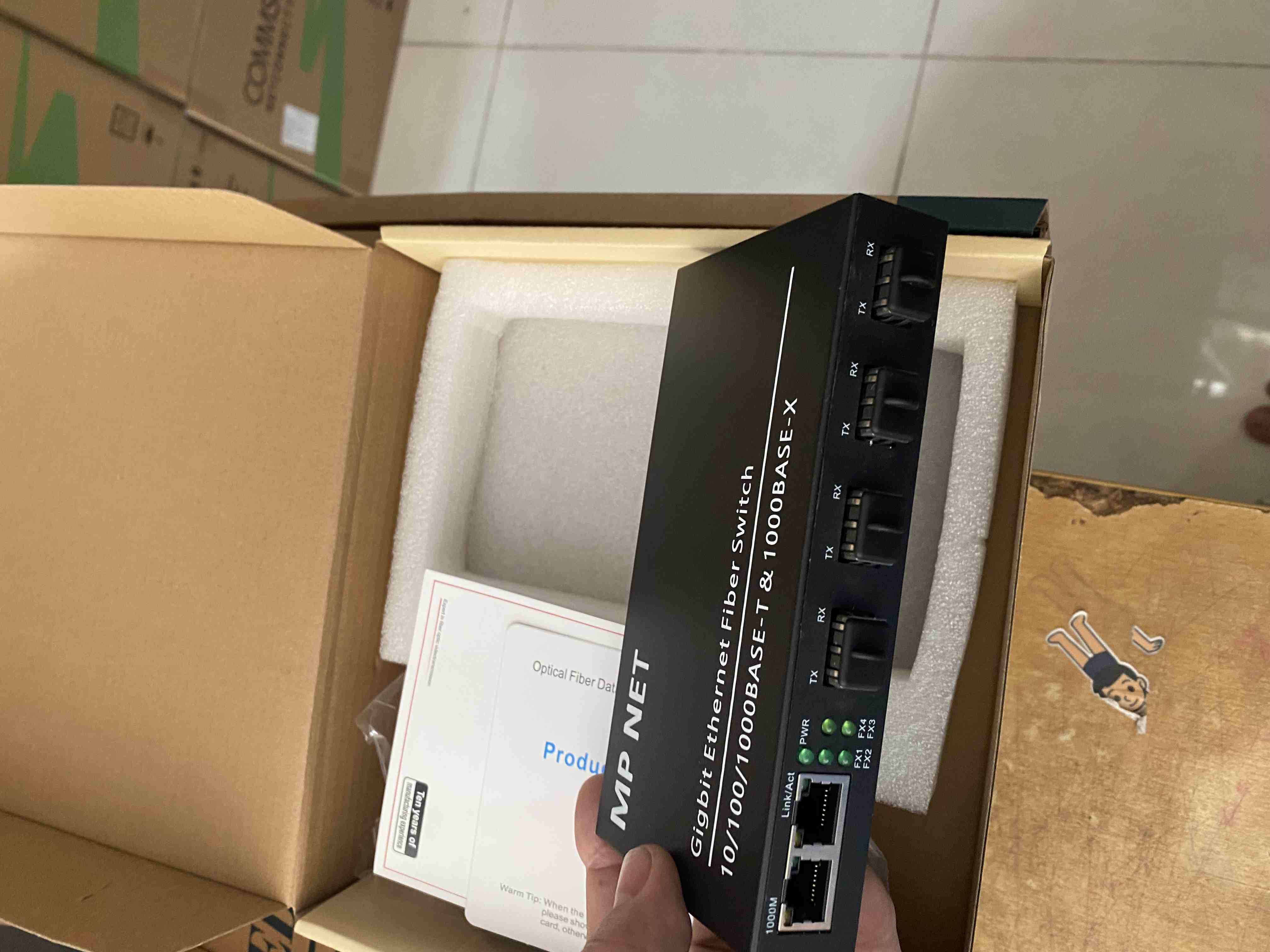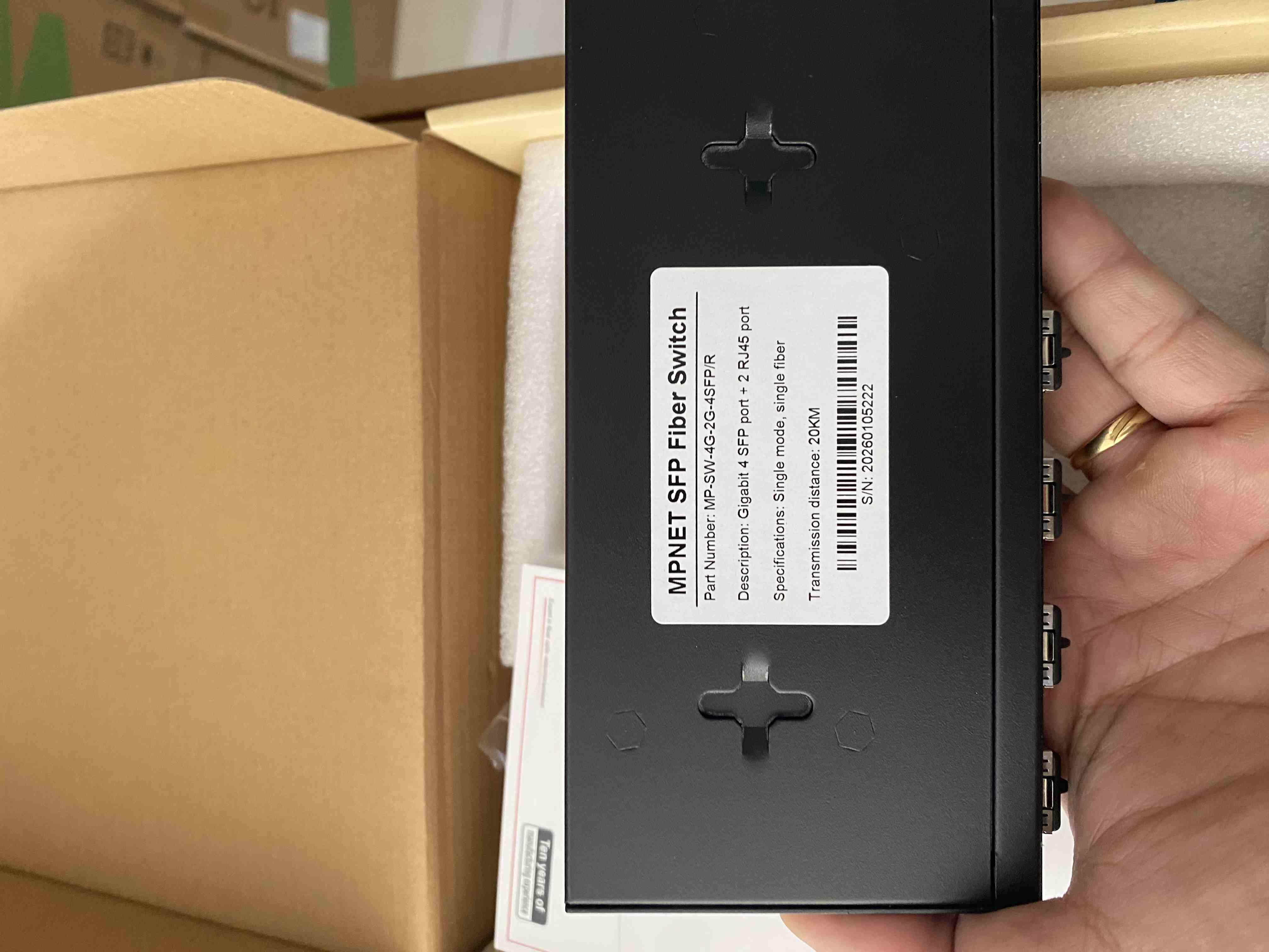 Bộ chuyển đổi quang điện 4 cổng SFP và 2 cổng Lan 1000M, Hãng MP NET MP-SW-4G-2G-4SFP/R Switch quang 4 cổng SFP, 2 cổng J45 10/100/1000M.Chuẩn tương thích: IEEE802.1 10Base-T, IEEE802.3u 100Base-TX, IEEE 802.3ab 1000Base-TX,IEEE802.3z 1000Base-SX/LX.Switch quang sử dụng Module kết nối sợi quang, 1 hoặc 2 sợi quang tùy vào Module quang SFP.Tốc độ cổng điện: 10/100/1000Mbps (RJ45).Tốc độ cổng quang: 1000Mbps.Khoảng cách truyền cổng RJ45: 100 MétKhoảng cách truyền quang: 20Km.Cáp kết nối cổng RJ45: UTP 5E.Đầu kết nối quang: 4 Port SFP 1.25GUplink: 2 Port Gigabit Hãng sản xuất: MP NETBảo hành: 12 Tháng