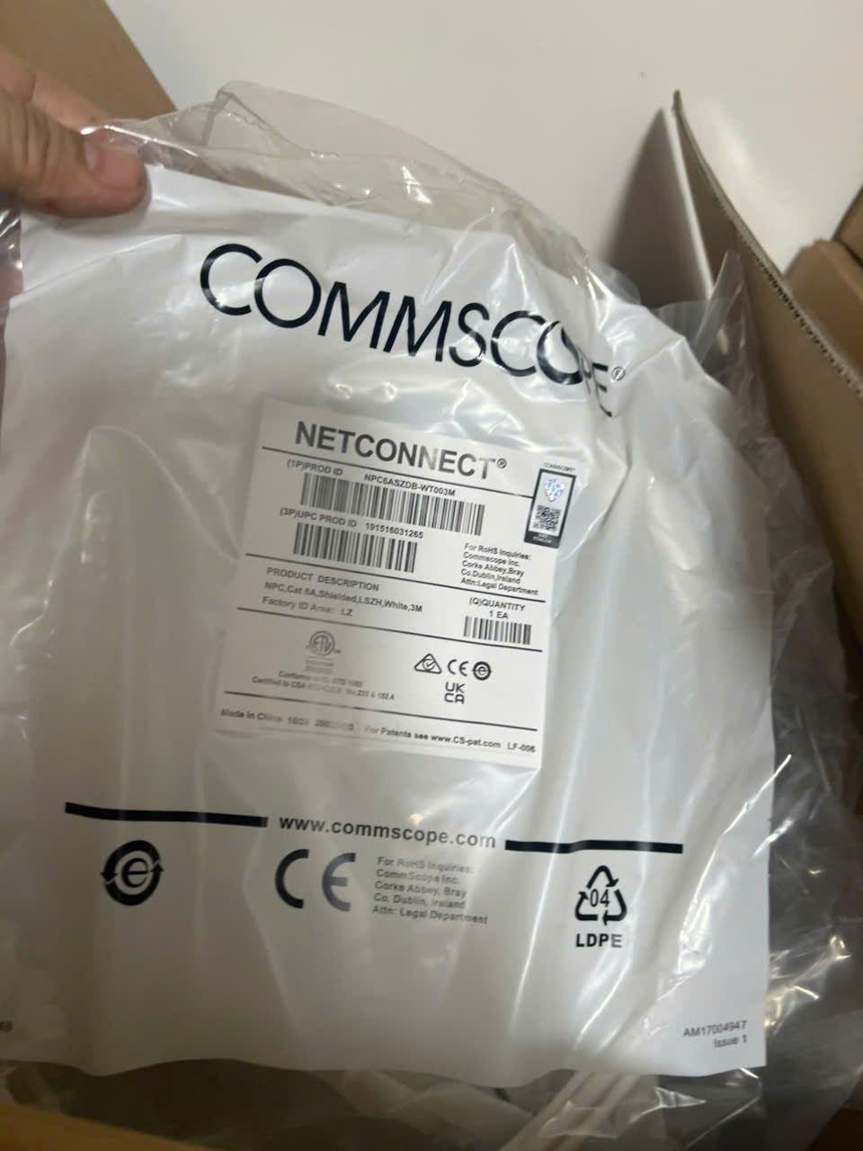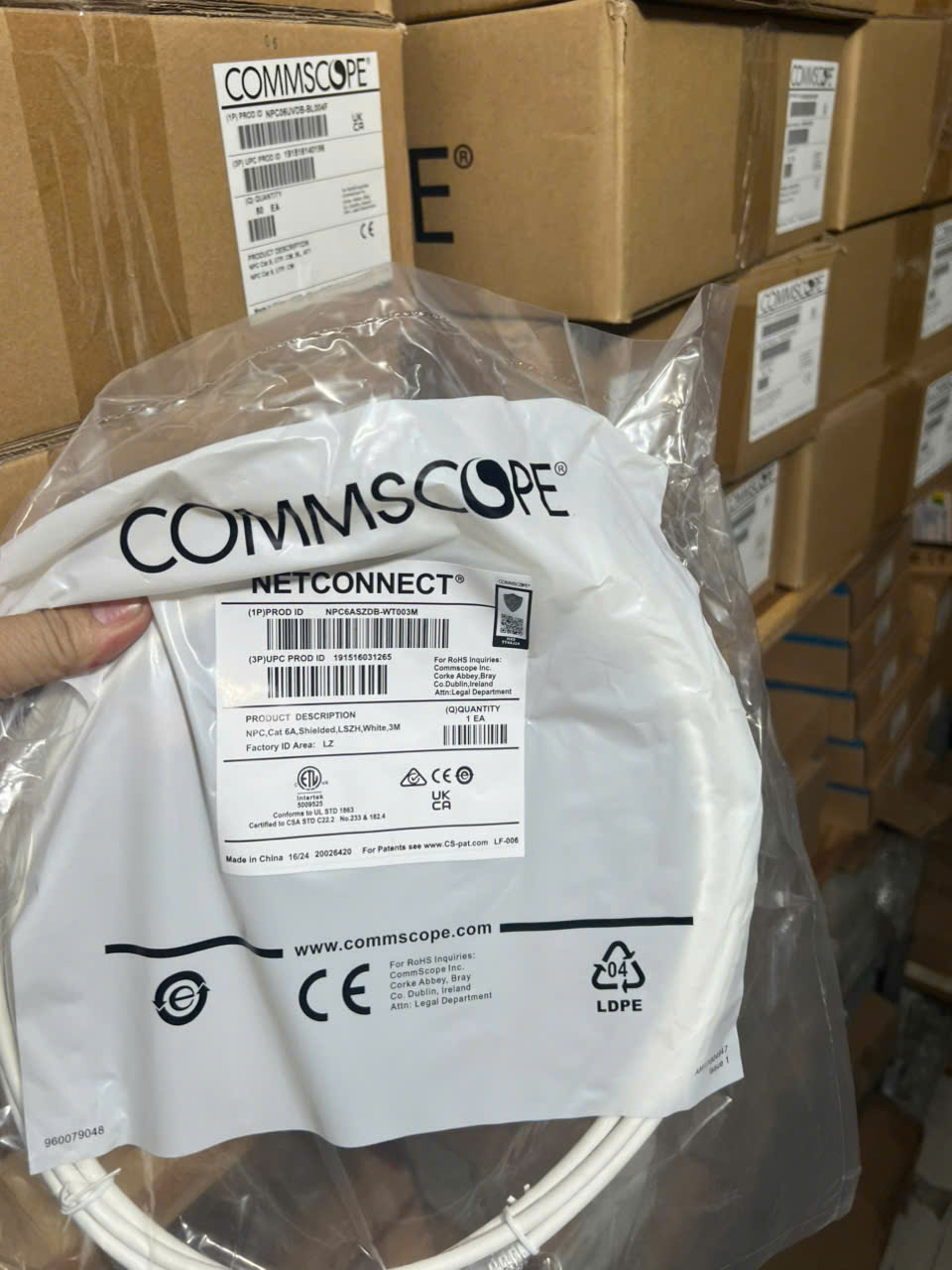 Dây Patch Cord Cat6A chống nhiễu 3M COMMSCOPE P/n NPC6ASZDB-WT003MDây Patch Cord Cat6A chống nhiễu 3M COMMSCOPE P/n NPC6ASZDB-WT003MCáp nhảy-Patch cord COMMSCOPE CAT6A F/UTP 3 mét (NPC6ASZDB-WT003M)Part Number: NPC6ASZDB-WT003M- Cable assy, CAT6A, F/UTP, LSZH, White, 3m.- Product Type: Twisted pair patch cord- ANSI/TIA Category: 6A- Cord Length: 3 m- Diameter Over Jacket: 6 mm- Environmental Space: Low Smoke Zero Halogen (LSZH)- Operating Temperature: -20 °C to +60 °C (-4 °F to +140 °F)- Safety Standard: UL 1863- Cable Type: F/UTP- Jacket Color: White